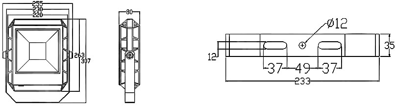 | 				燈體材質(zhì):壓鑄鋁+鋼化玻璃+沖壓支架			 | 							燈體尺寸:Φ230*263*80mm			 |