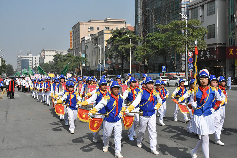 活動現場彩旗飄揚,鑼鼓喧天,熱鬧非凡。巡游路線沿途兩旁還設置了7個演出舞臺,各中小學校,文藝團隊傾情演出,用歌聲、舞蹈、樂器共同奏響橫欄愛的樂章。